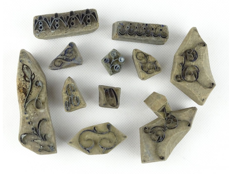12 darab antik kékfestő nyomóminta, pecsételő különböző méretekben. Faragott keményfába illesztett réz iniciálés betűk és különböző növényi motívumok.