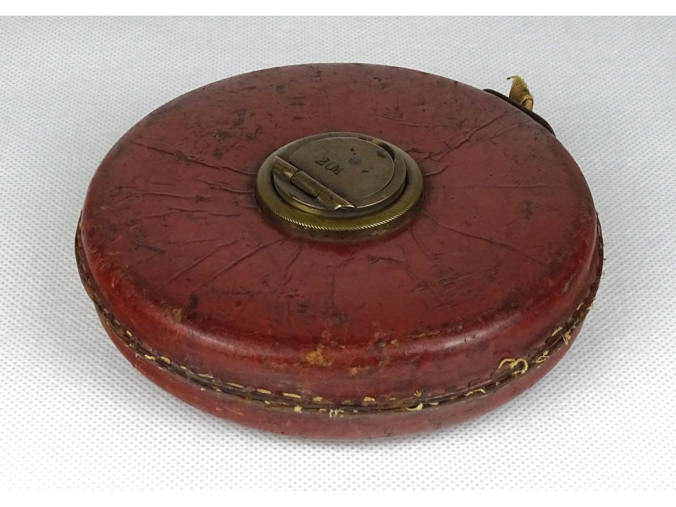 Kemény bőrtokos mérőszalag 20 m-es, fém részei sárgarézből készültek. Az első cca 50 cm hiányzik róla.