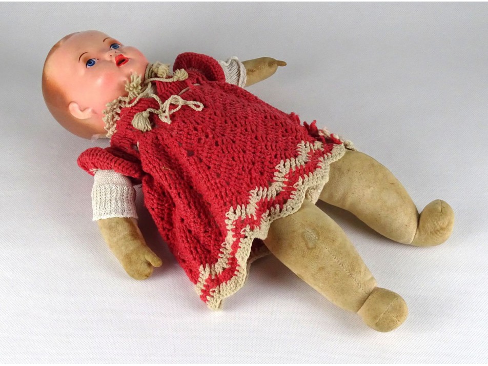 Régi, felruházott játékbaba, piros rúzsozott szájjal. Feje kerámia, teste, végtagjai rongyból készültek.