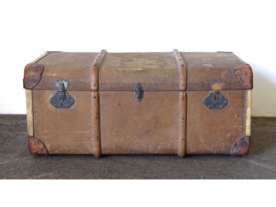 Antik monarchia korabeli, fából készült, gőzölt, hajlított keményfa pántokkal erősített, bőr koptatókkal rendelkező, nagyméretű utazó láda, hajóláda, koffer, bőrönd réz veretekkel.