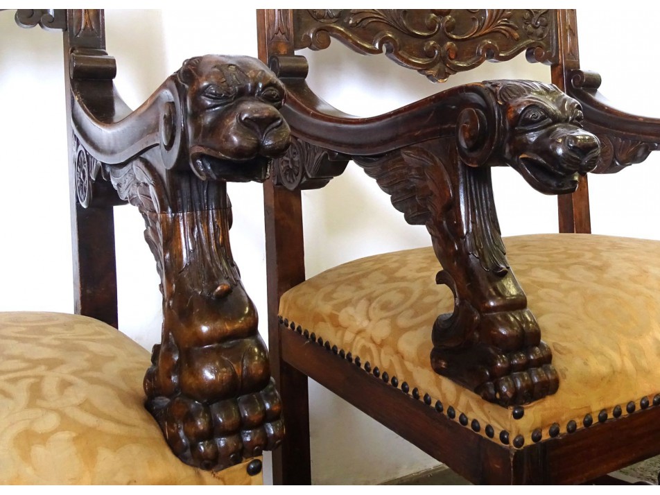 Gyönyörű antik trónszék pár, hatalmas támlás székek. Háttámla közepe faragott oroszlánfejjel díszített. A karfa végei szintén oroszlánfejben végződnek. Nagyon dúsan faragott, díszített, közel egyforma méretű darabok. 1830-1850 körüli darabok. Kastélybútorok!