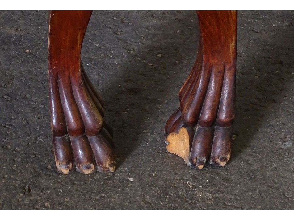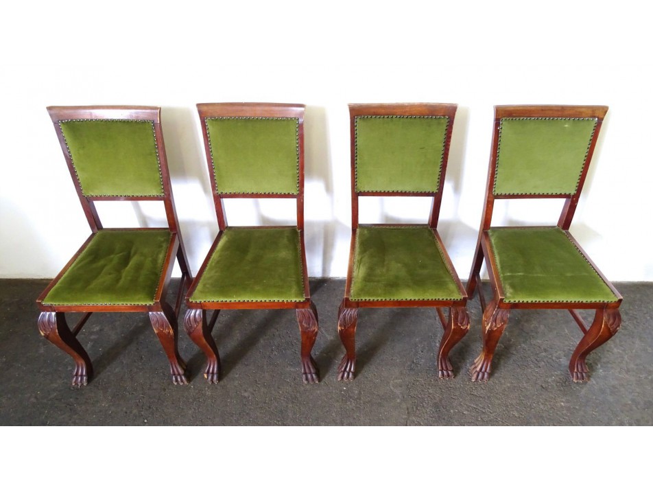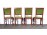 Szép állapotú, egységesen kárpitozott támlás, étkezőasztal szék garnitúrája, négy darab. Az egyik szép lába kissé sérült, lásd fotó.