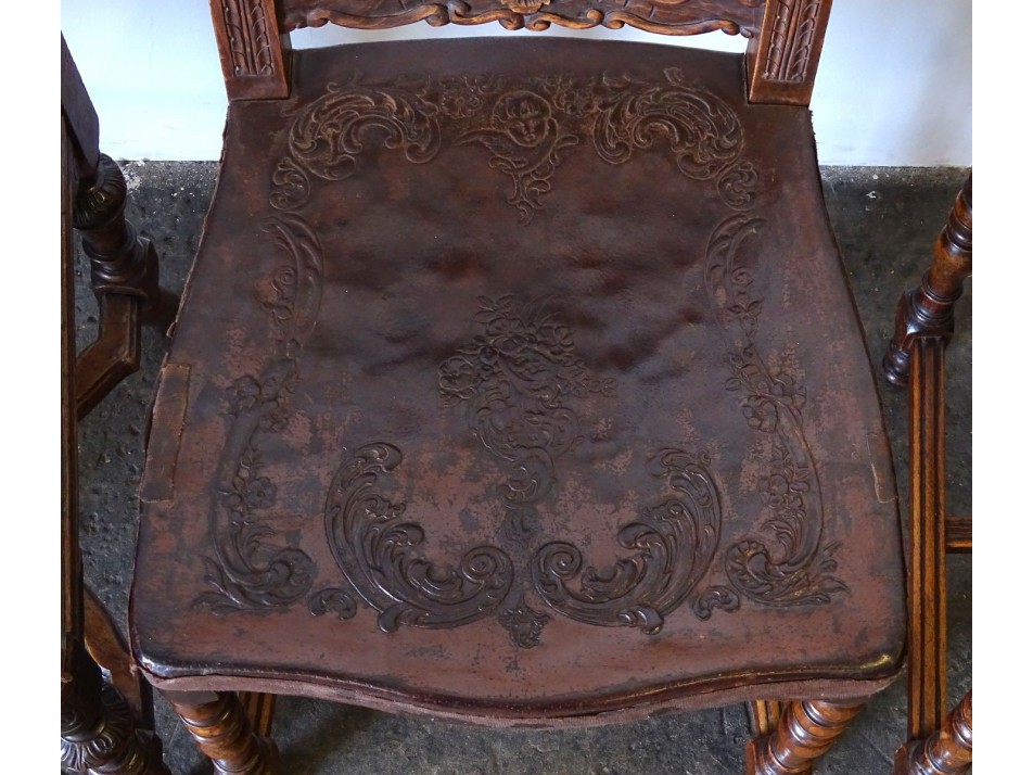 Antik faragott szék garnitúra. Faragott díszekkel, lábakkal és bőr bevonattal rendelkeznek. Szélén körben gyönyörű réz szegecsekkel díszített. A támla és ülőfelület angyalkás nyomott mintás felületek. A felületek nem mindehol épek, lásd fotó. Az egyik szék faragása díszítettsége eltér a többitől.