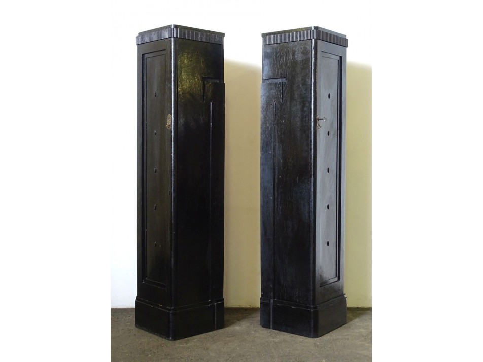 Antik, szép állapotú, karcsú fekete szekrény pár, szobortartó állvány. Belseje polcos, mindkettő működő zárral és egy darab kulccsal rendelkezik.