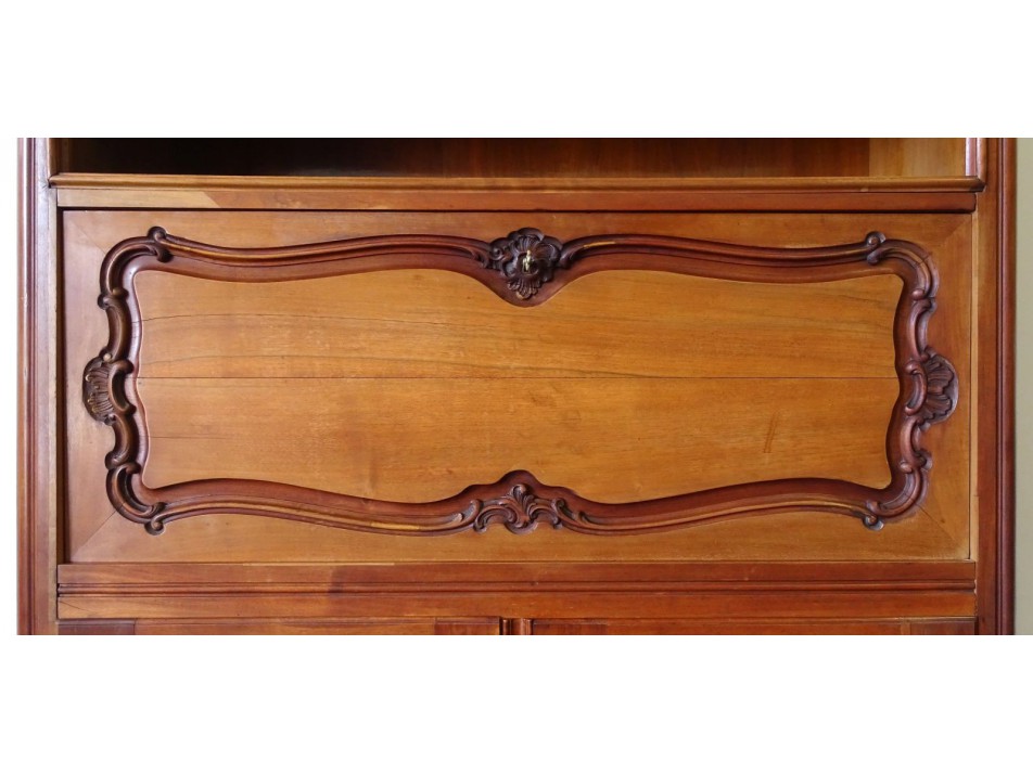 Gyönyörű, antik, faragványokkal gazdagon díszített nagy méretű könyvszekrény, írószekreter az 1800-as évekből. Középső részén lenyitható írófelület és tároló rész található A bútor szép állapotban van, azonnal enteriőrbe helyezhető.