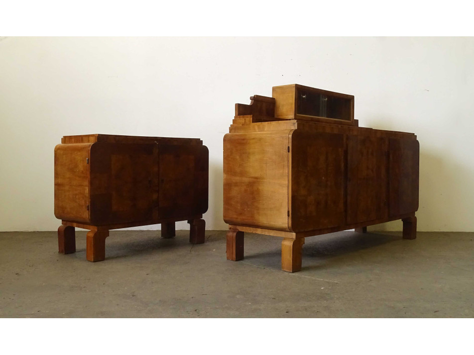Gyönyörű, régi, art deco 2 darabos tálaló garnitúra. A bútor igényes, dió, diógyökér furnérozású.