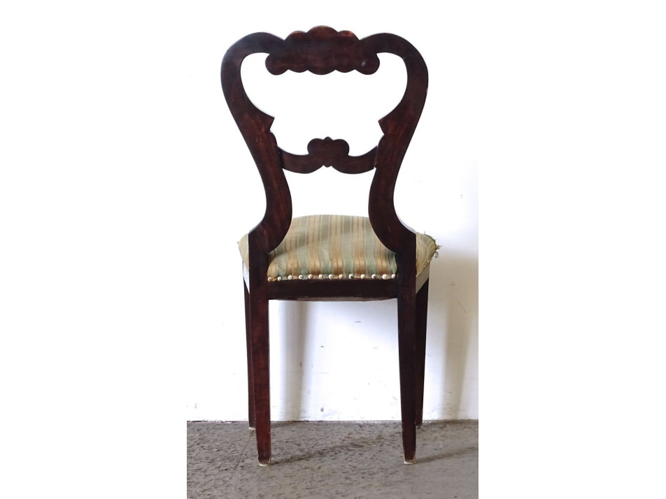 Antik Biedermeier szék az 1800-as évek második feléből, cca 1880. Ülőfelülete epedarugós. Kárpitja feslett, lásd fotó. Az ülőfelület széle körben festett fém szegecsekkel díszített.