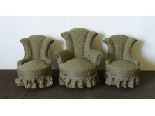 Régi 9 darabos habos kőris svartnis, gyönyörű cseresznyefa, komplett szalon garnitúra. Remek összhatású, felújított, újra kárpitozott ülő garnitúra, kiegészítőkkel. Felületük rugós, nagyon kényelmes. Gyönyörű, áttört díszes faragásokkal díszített sarokvitrin.