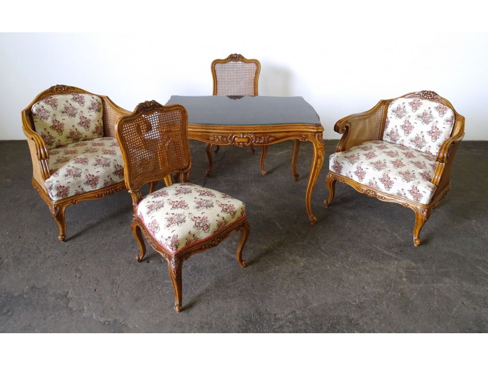 Régi, öt darabos, gyékény fonatos, nagypolgári barokk szalon garnitúra. A fa szerkezetek épek, dúsan faragott díszítésűek. A gyékényezések épek!