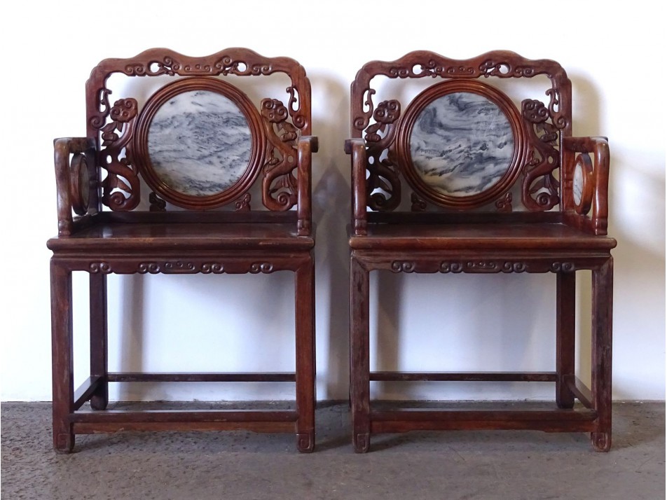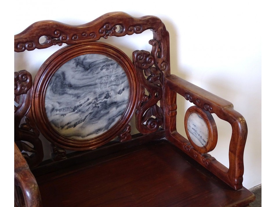 Gyönyörű, egzotikus keményfából készült, áttört díszes, támlás, karfás szék. Faragott orientalista bútor. Támlájában és a karfák alatt kör alakú márvány betét található. Az 1900-as évek elejéről származó darab.