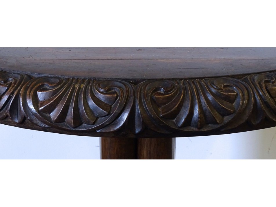 Antik, gazdagon faragott középen négyoszlopos körasztal, szalonasztal. Kissé kopottas, lásd fotó.