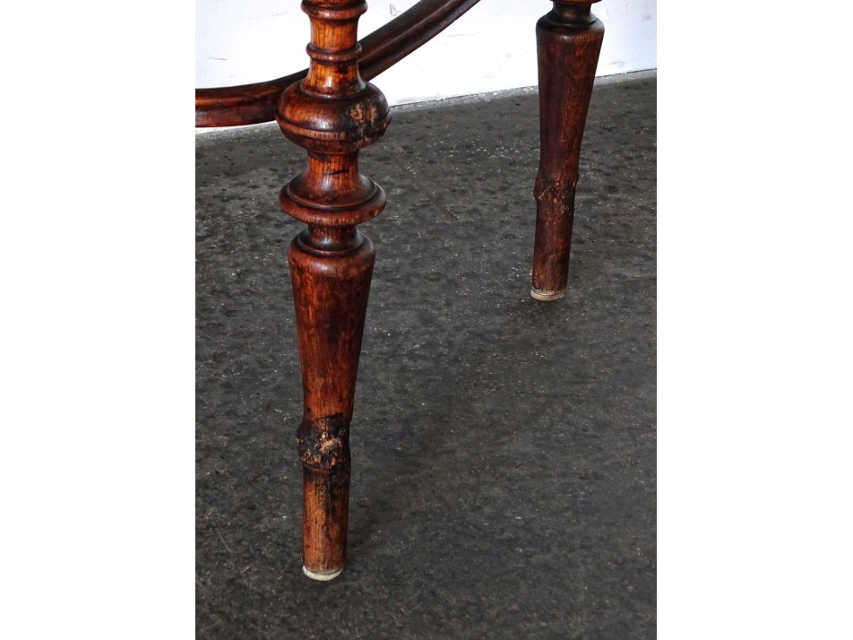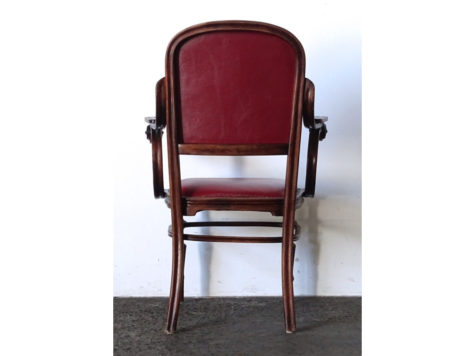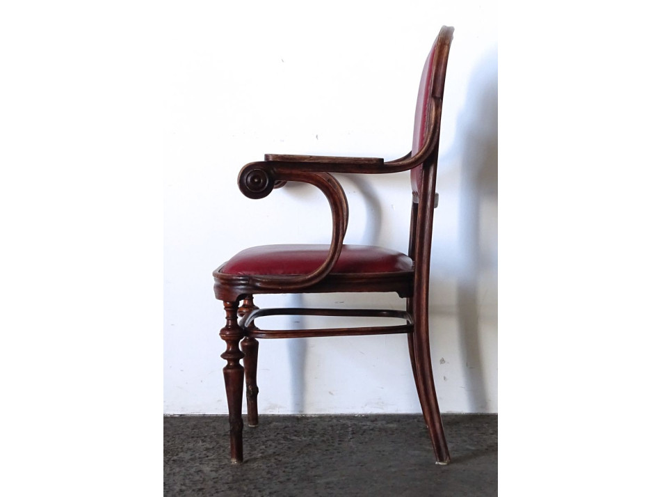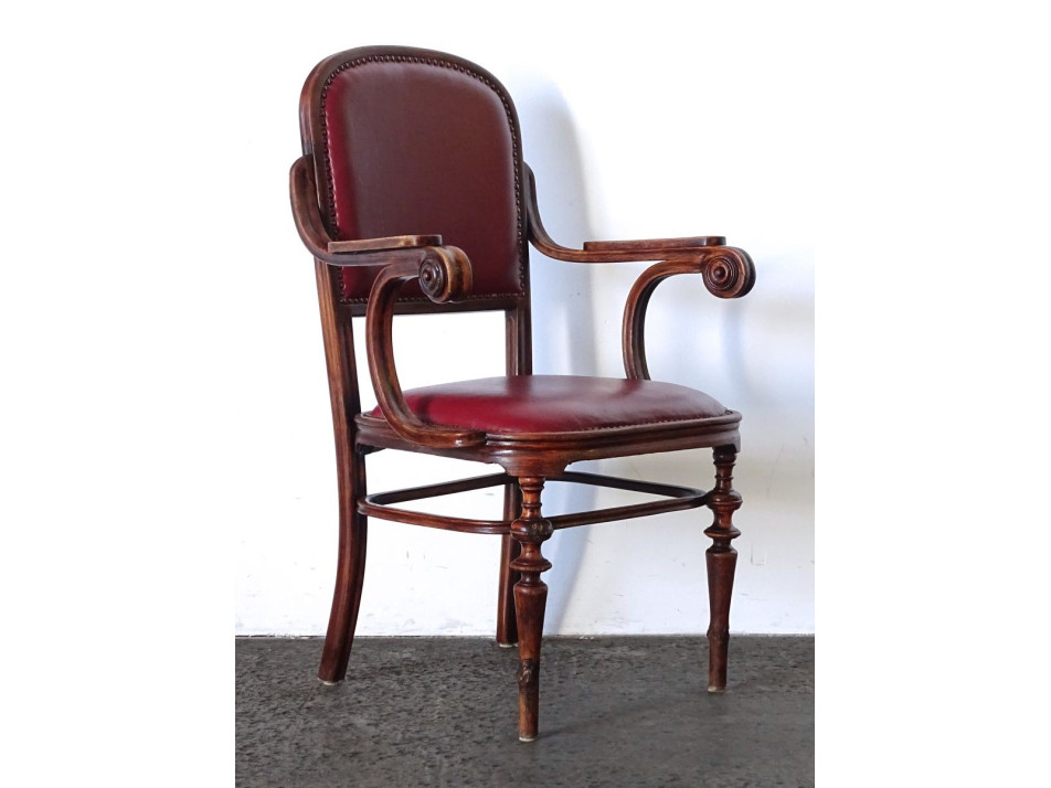 Antik szép állapotú támlás szék bőr felülettel. A kárpit körben szegecselt. Karfái csigás faragott díszítésűek.