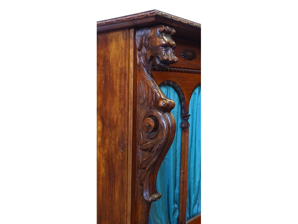Antik, faragott, üveges szekrény. Ajtaján két hatalmas faragott oroszlánkarmos, oroszlánfejes mitológiai lény dísz látható. Belsejében egy fiók és alatt polcos rész található. Két pár polctartója meg van, polcai nincsenek. Üveges ajtaján belülről zöld függöny található.