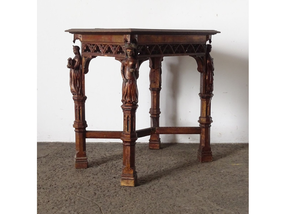 Antik, szép állapotban megmaradt, faragott gótikus asztal, kisasztal. Az asztalon korabeli kopottas aranyozás nyomai fellelhetők. Körben gazdag áttört faragással díszített, lábai is szépen faragottak, oszlopfőit négy darab különböző szent fafaragás díszíti.