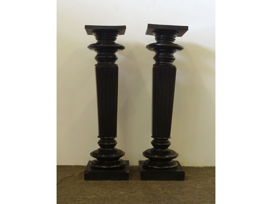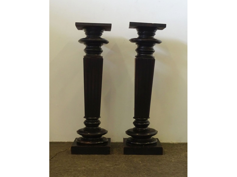 Antik, szép állapotú fekete színű faragott szobortartó állvány, posztamens. Felső lapján a furnér viseltes. Az egyik posztamens kissé instabil, javításra szorul.