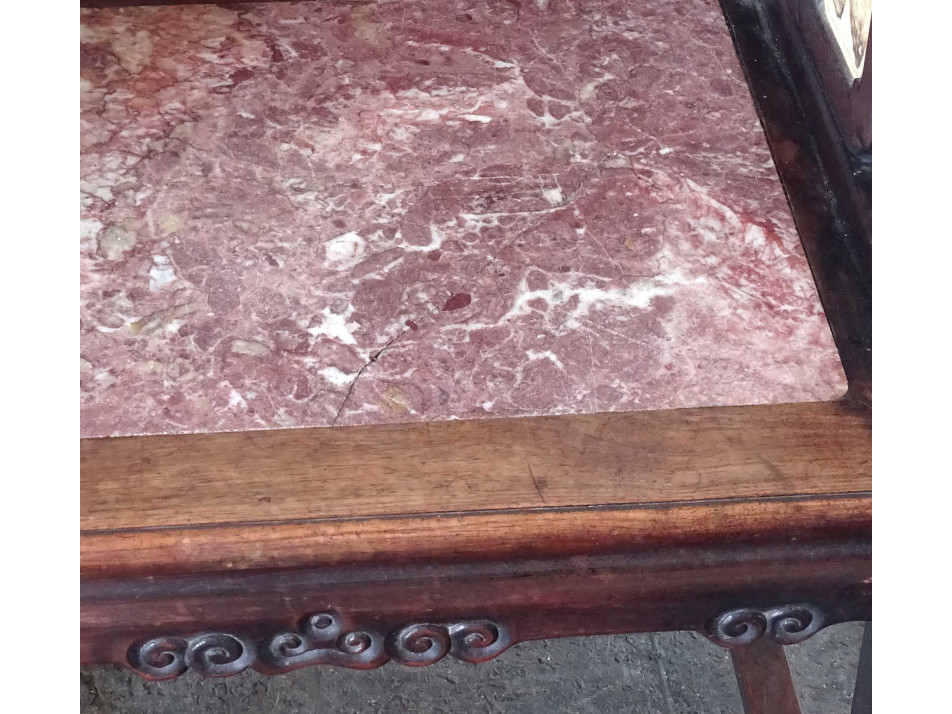 Gyönyörű, egzotikus keményfából készült, áttört díszes, támlás, karfás szék. Dúsan faragott orientalista bútor. Támlájában és a karfák alatt kör alakú márvány betét található. Az 1900-as évek elejéről származó darab.