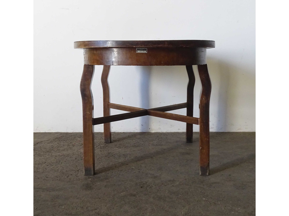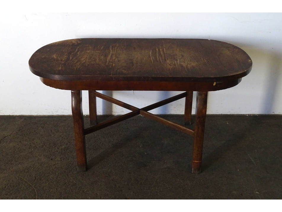 Régi, sérült, felhullámosodott furnér borítású ovális ebédlő aszta.