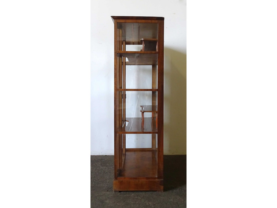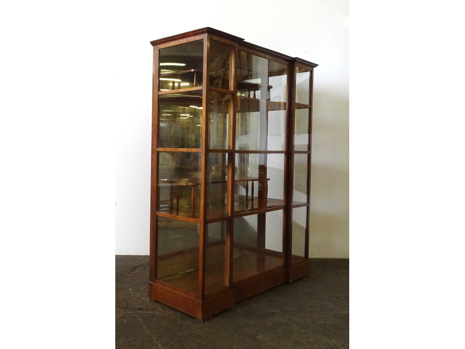 Antik, szép állapotú üveges, tükrös vitrin. Körben teli üveges, hátul tükrökkel. Három polcos, amiből kettőn nipptartó kisméretű emelvény található. Az ajtó működő zárral és egy darab kulccsal rendelkezik. RITKA!