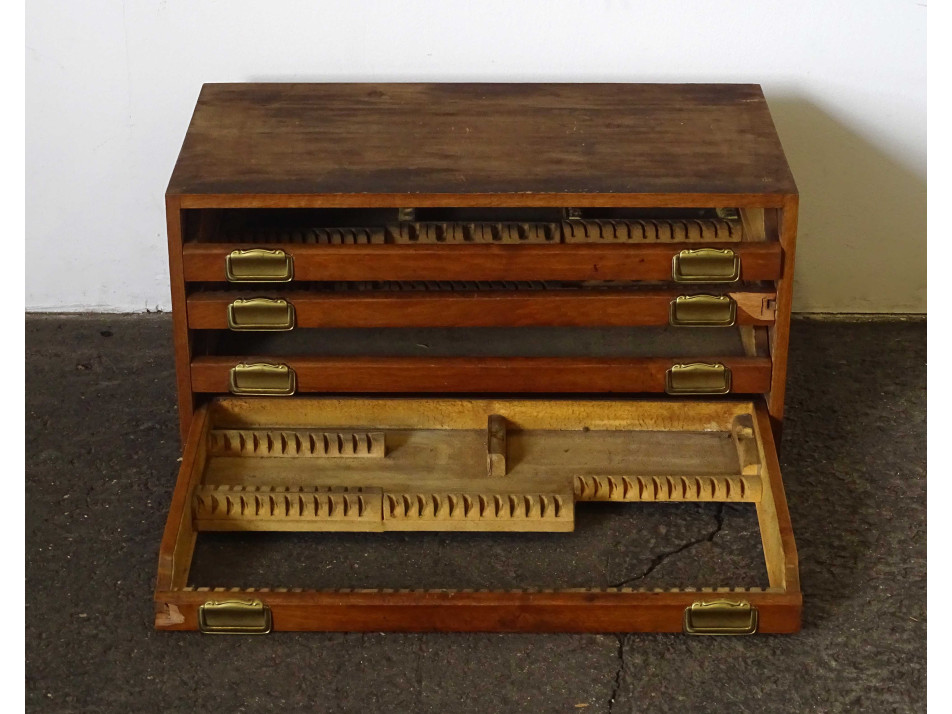 Szép állapotú, vászonnal bélelt, speciális evőeszköz tartó, négy fiókos kis szekrény vagy doboz. Nyitott kialakítása miatt eredetileg egy tálalószekrény tartozéka lehetett. 12 személyes evőeszköz készlet minden tartozékának tárolására szolgált.