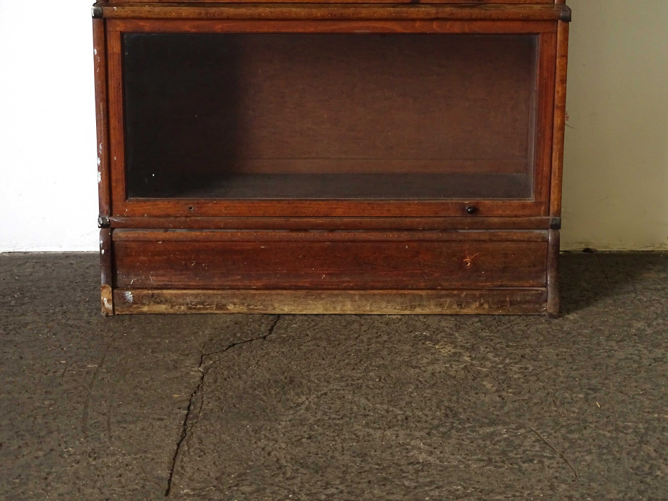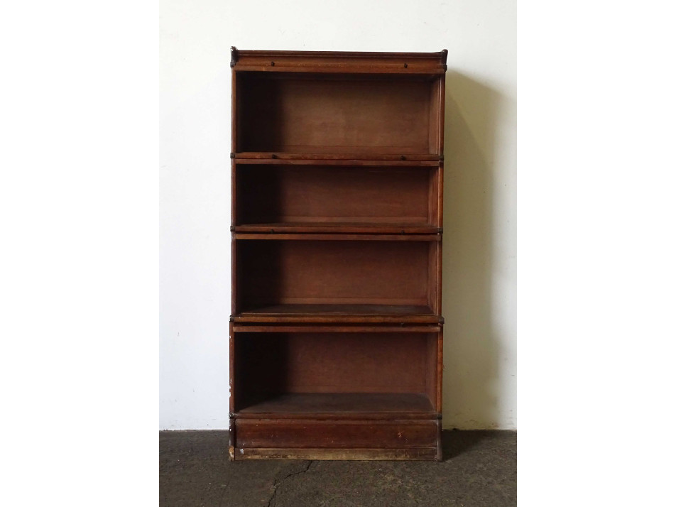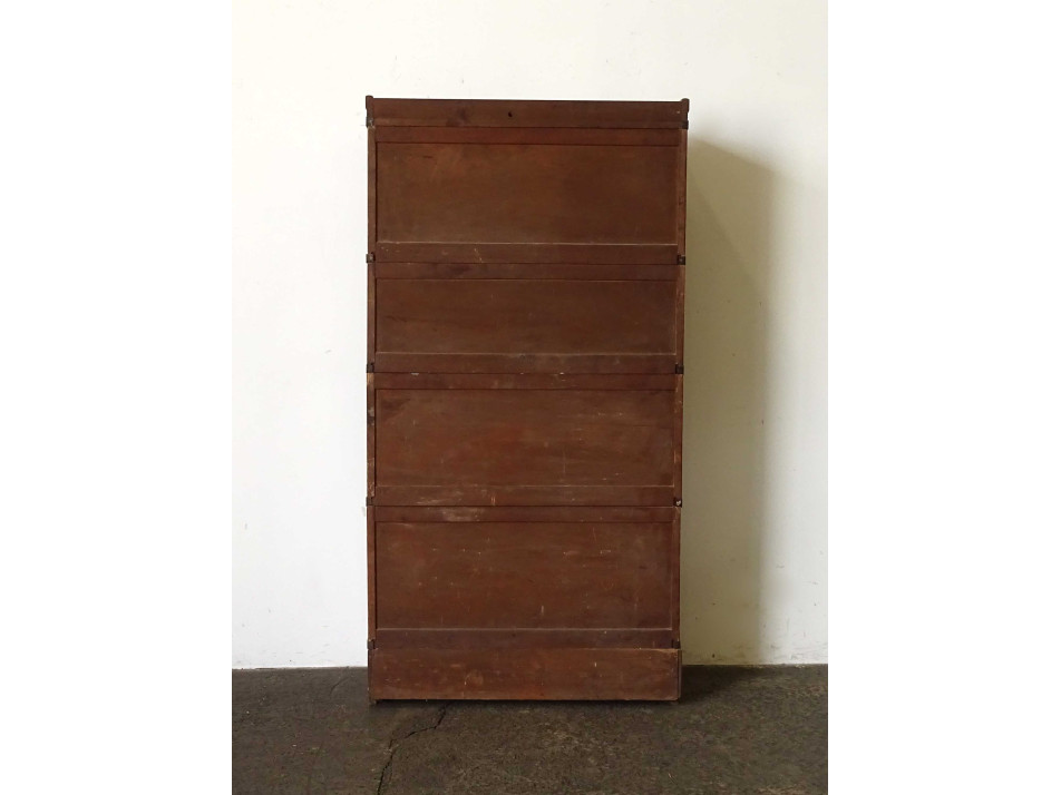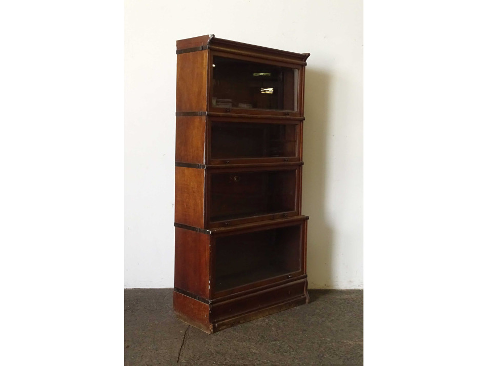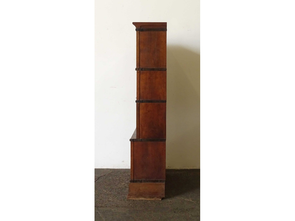 Antik, szép állapotú, pántolt négy elemes Lingel szekrény, felfelé nyíló üveges ajtóval rendelkező bútor, könyvszekrény, polc. Elemekre szedhető. Cirka 2-250 könyv fér el benne.