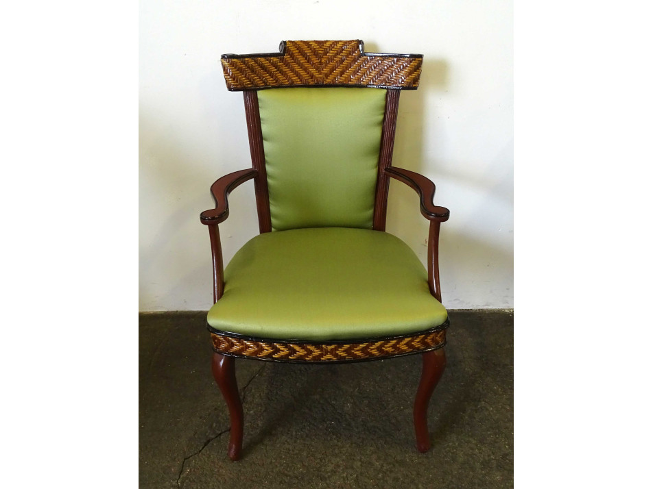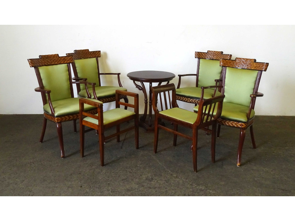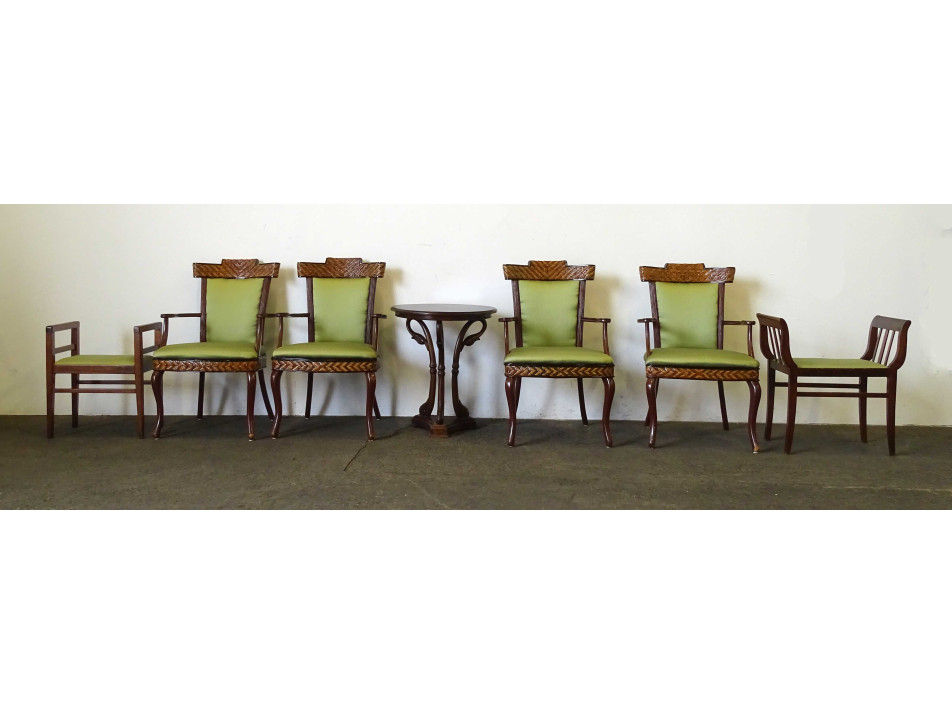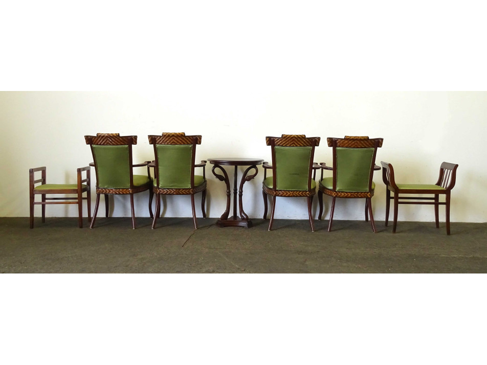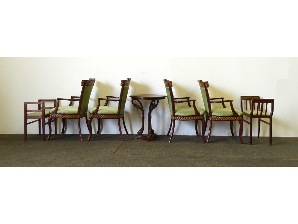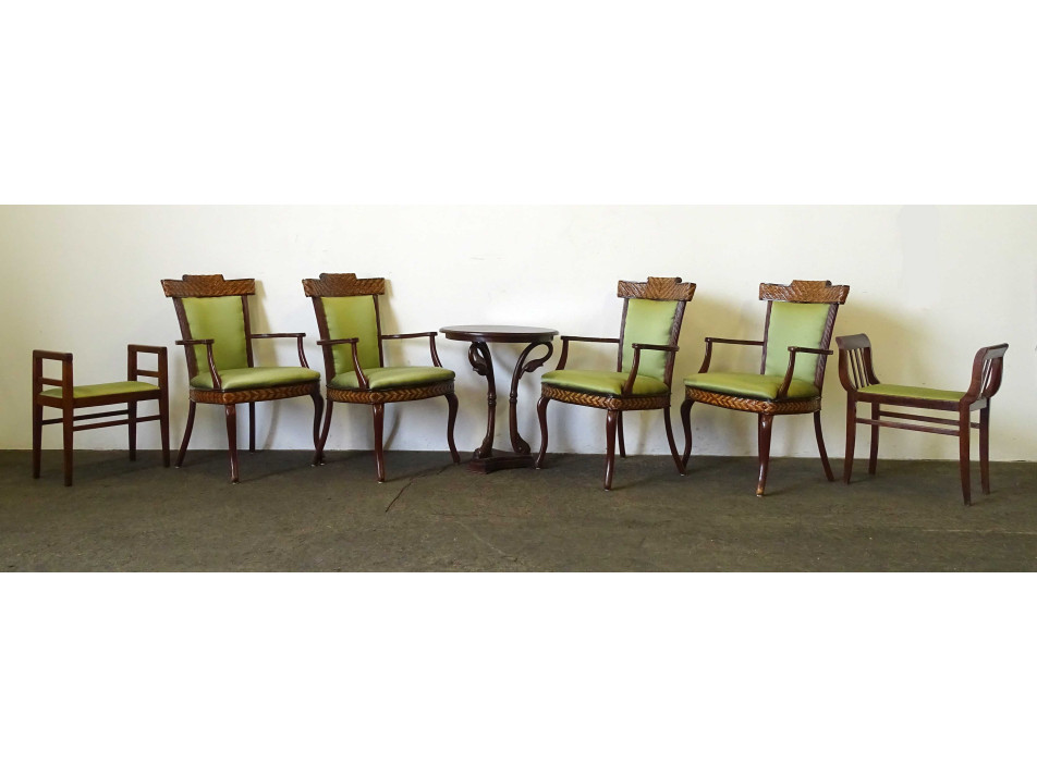 Antik, hét darabból álló szalongarnitúra. Gazdagon faragott, stilizált hattyút ábrázoló lábakon álló körasztallal, négy darab nádfonattal díszített zöld kárpittal borított karosszékkel és két eltérő stílusú, de azonoszöld kárpittal burkolt karfás zsámollyal, etruszkkal.