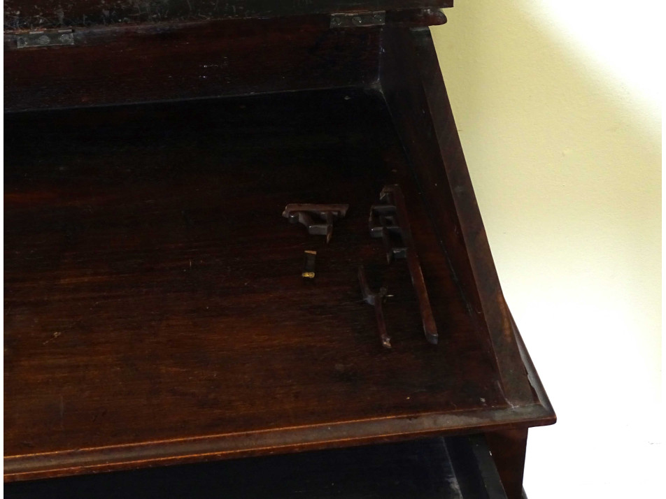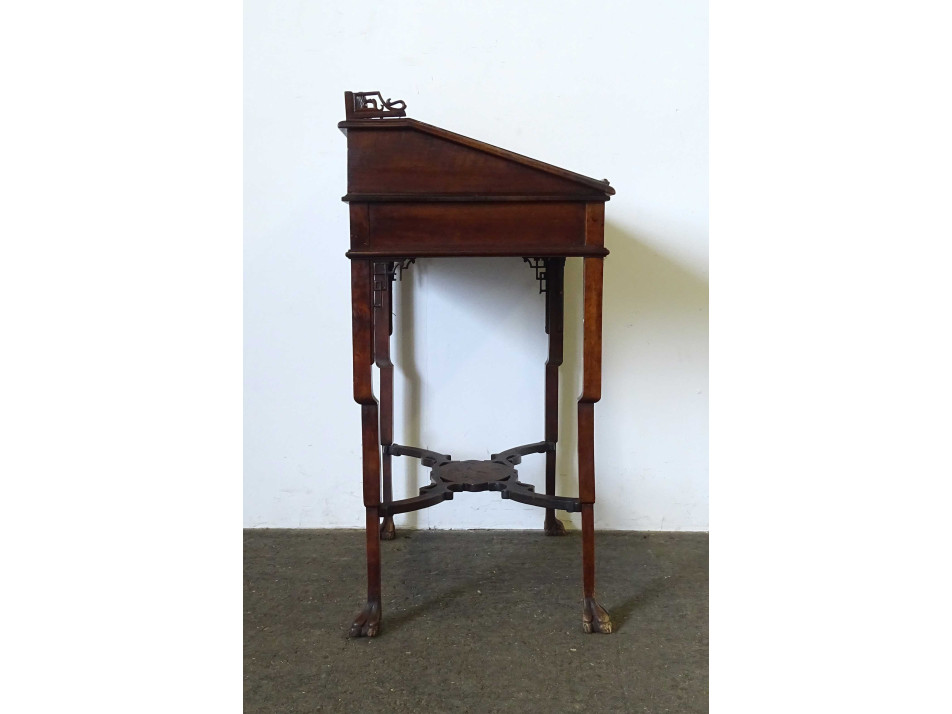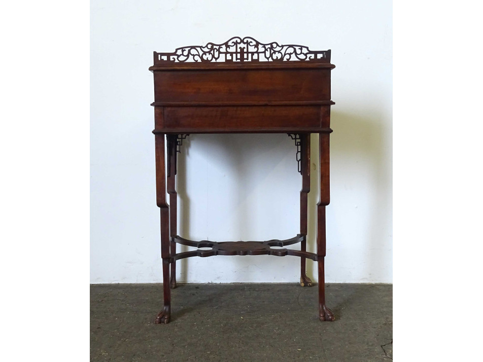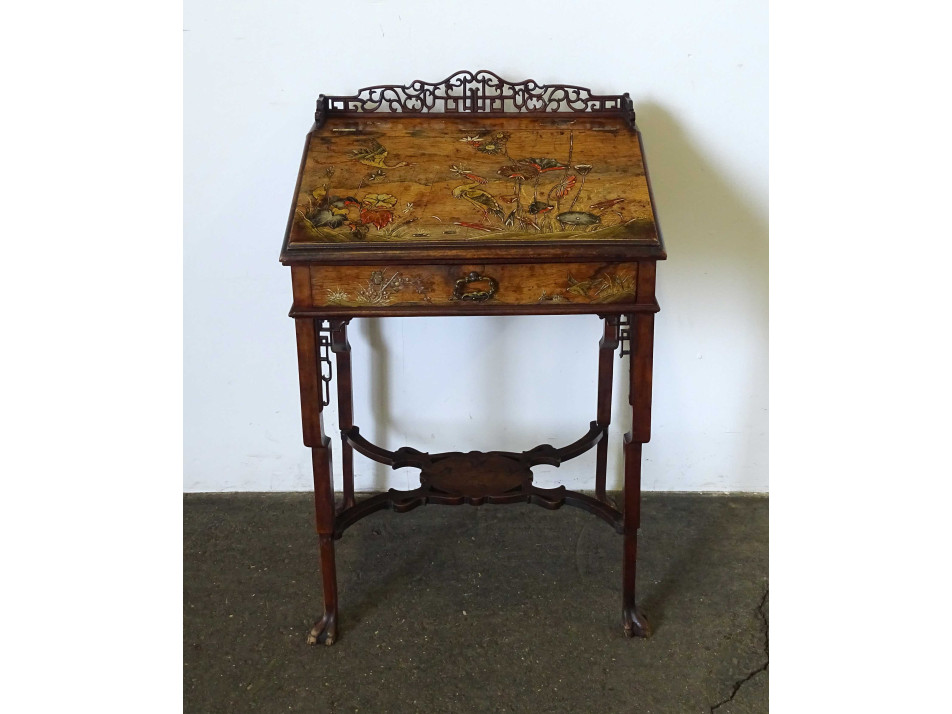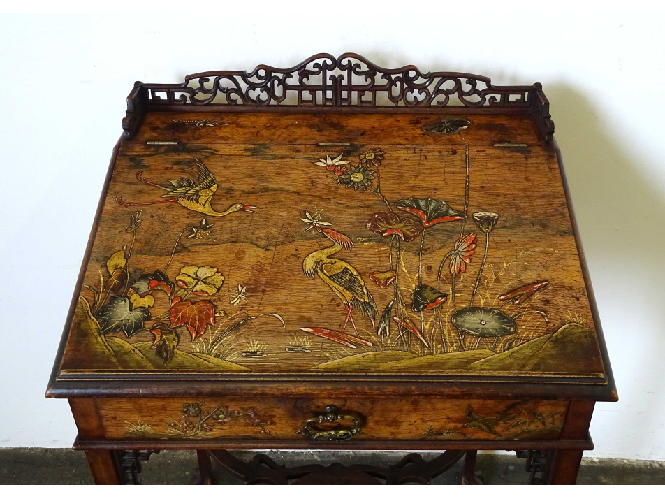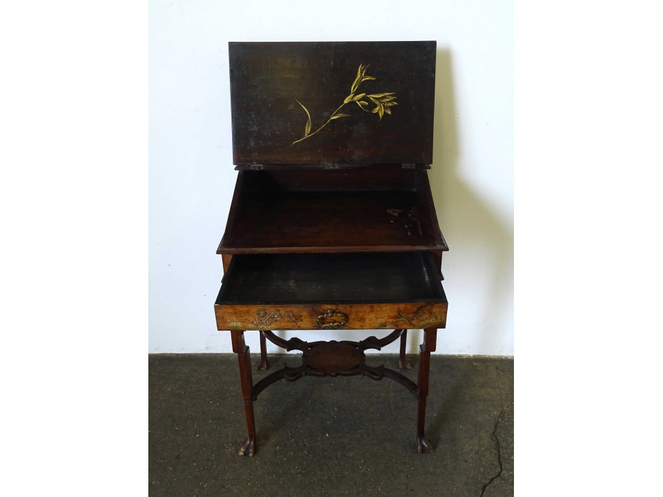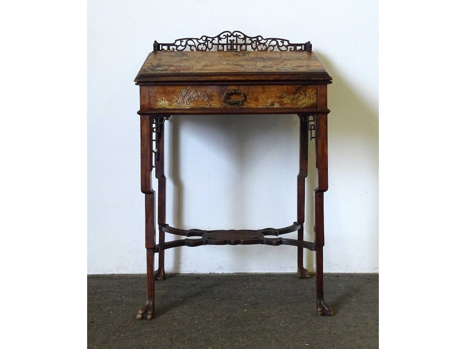 Antik, gyönyörű, gazdagon faragott, keleti, kínai fiókos kis asztal, íróasztal, szekreter. A bútor felnyitható fedele és fiókja domború intarziával gazdagon díszített, tetején nagyméretű, igen részletgazdag gyönyörű vizimadarakat és virágokat ábrázoló intarzia díszítés található. Tetején és a lábak csatlakozásánál áttört faragványok díszítik. Ezek közül több is sérült, hiányos. A bútoron kisebb furnérhibák találhatók .