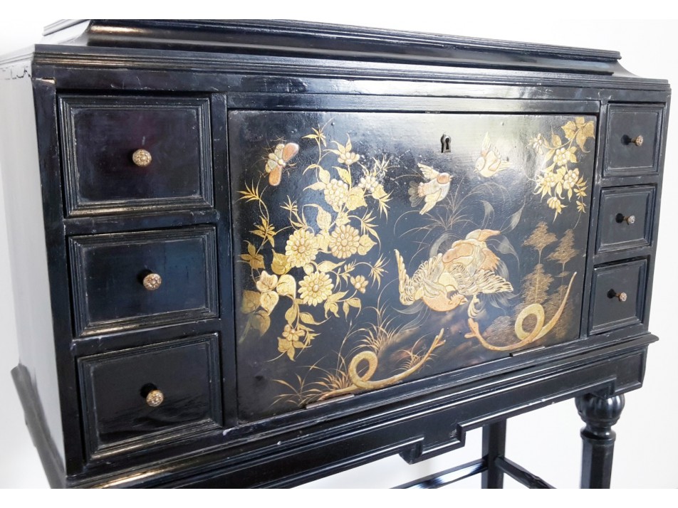 Antik, sokfiókos, intarziás, fekete lakk kabinet szekrény, lehajtható írófelülettel.