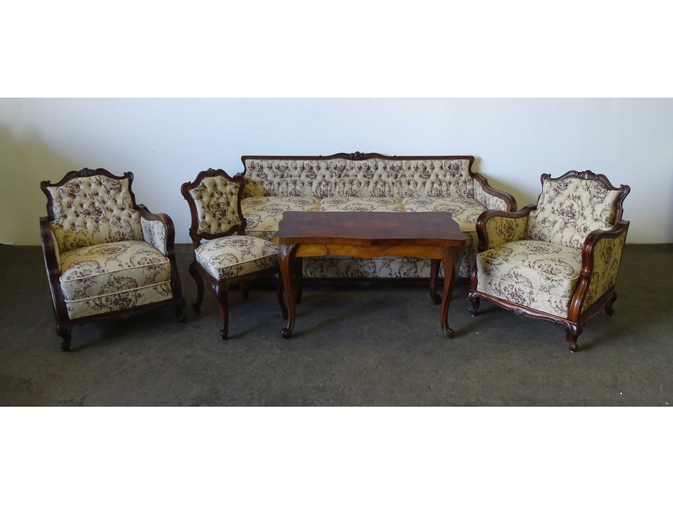 Komplett, nagypolgári, neobarokk szalon garnitúra az 1900-as évek első feléből. Egységes, felújított virágmintás kárpitozással.