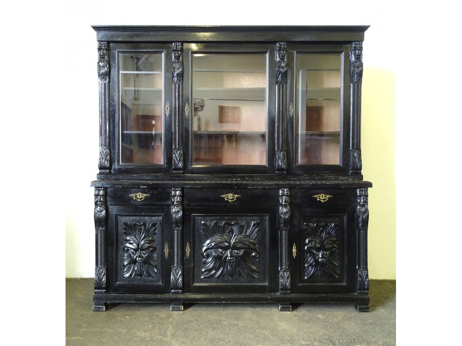 Antik fekete színű, szép állapotú, nagy méretű, dúsan faragott ónémet tálaló szekrény, üveges, polcos résszel, az 1800-as évek végéről. Három darab fiókkal rendelkezik, rajtuk egységes gyönyörű réz veretek. Az ajtókon hatalmas faunfej díszítés található. Összesen 11 darab faragott faunfej található rajta.