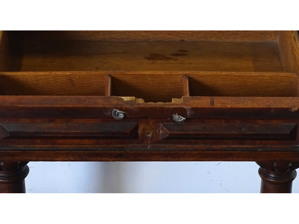 Antik eredeti, felújítatlan állapotban lévő stabil szerkezetű, ónémet varróasztal, pipere asztal. Az asztal egy kisméretű, osztott fiókkal rendelkezik. A fiókban zár található.