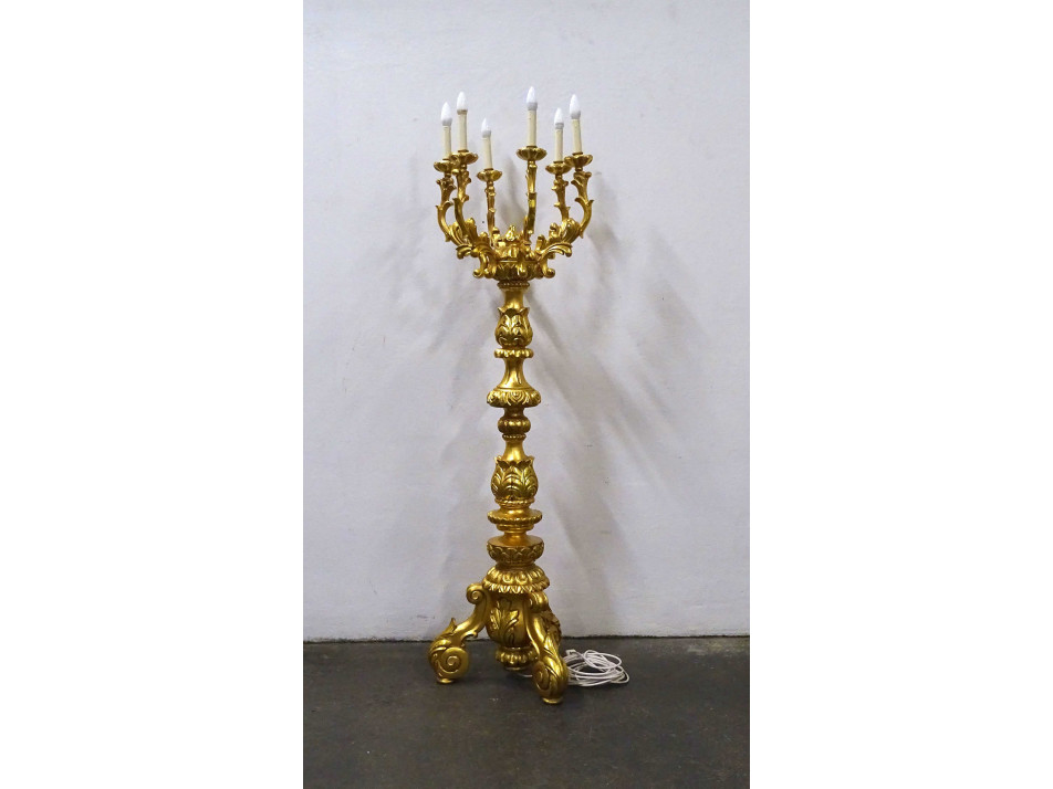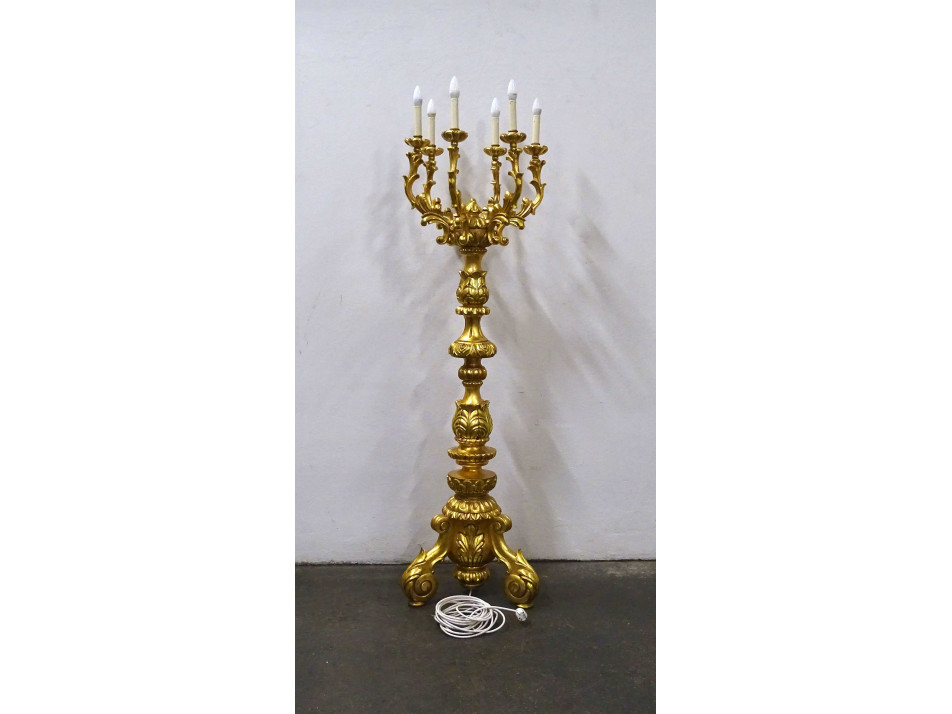 Antik, rendkívül díszes, hatkarú, nagy méretű, laparanyozott fa testű kandeláber, gyertyatartó hatású állólámpa. A vezetékezése korszerűsítve van, az egész lámpa szakszerűen lett felújítva, restaurálva.