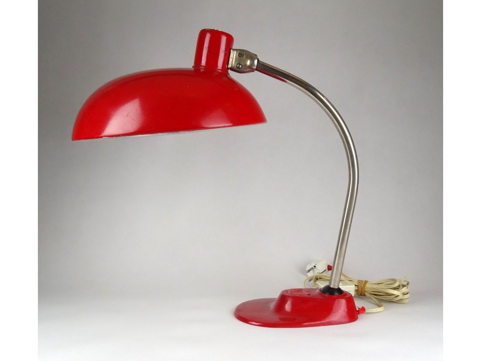 Régi, bauhaus design íróasztali fém lámpa, hajlított, ívelt szárral, mely a talphoz gömbcsuklóval csatlakozik. Rajta piros fém búra. Az öntöttvas talpból a kapcsoló hiányzik. A lámpa működő állapotban van.