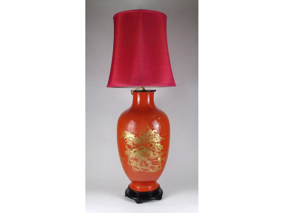 Régi, szép állapotú narancssárga színű fa testű állólámpa, piros színű burával. A lámpa teste arany színű tájképekkel körben díszített. Fa talapzaton áll. Működőképes állapotban van. Nagy méretű (E27-es) izzó való bele.