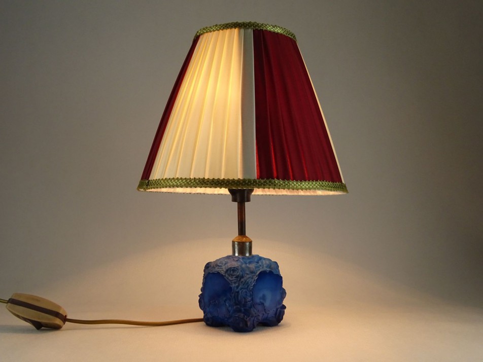 Régi, különleges, kék üvegtestű, kalcit üveg asztali lámpa, éjjeli lámpa bordó burával.