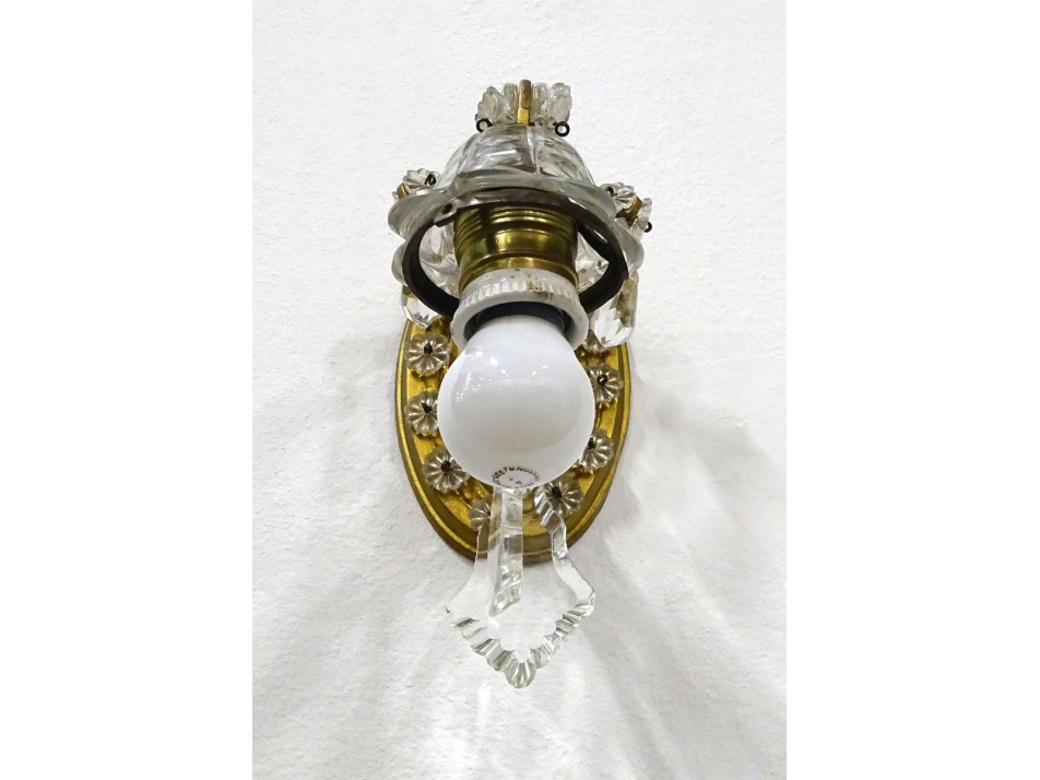 Régi, aranyra festett fém talpas falikar kristály díszítésekkel. A kar papírmasé gyertyában végződik. Nagyméretű (E27) izzó való bele. Szép, azonnal felszerelhető állapotban.