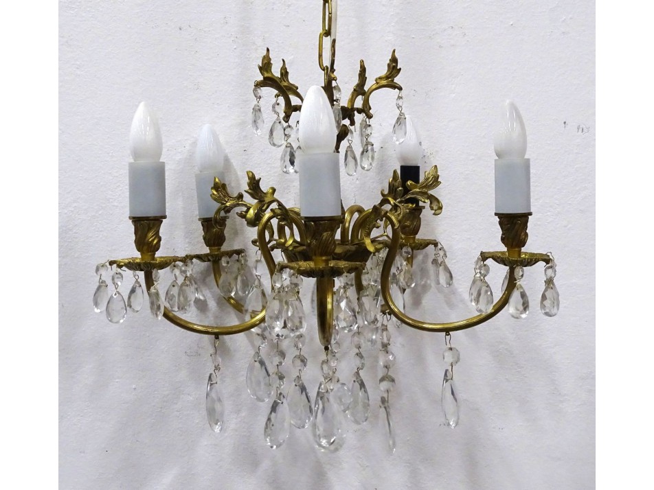 Szép állapotú öt égős kristálycsillár, réz testen. A karok porcelán gyertya csonkokban végződnek egy hiányzik, kis méretű (E14) izzó való bele.