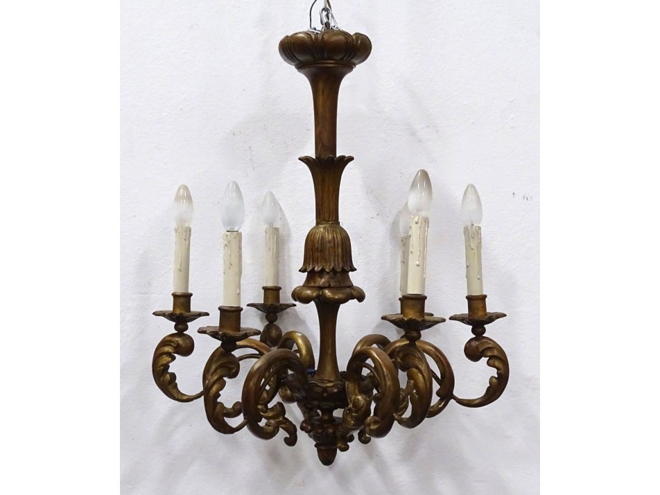 Antik aranyozott hatkaros faragott fa csillár 70 x 60 cm