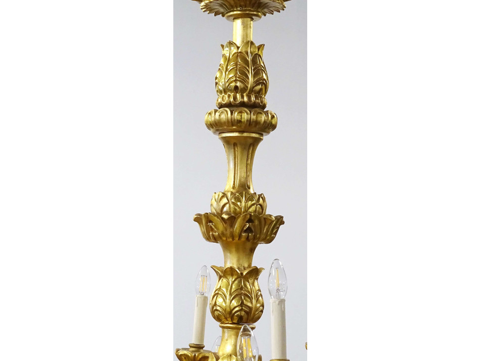 Antik, HATALMAS rendkívül díszes, harminc égős, nagy méretű, laparanyozott fa testű csillár, gyertyatartó hatású mennyezeti lámpa. A vezetékezése korszerűsített. Gyönyörű állapotban.