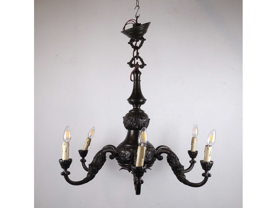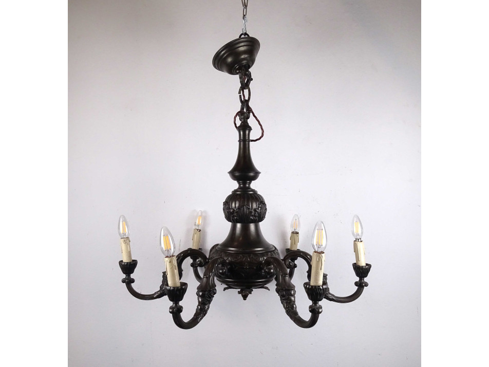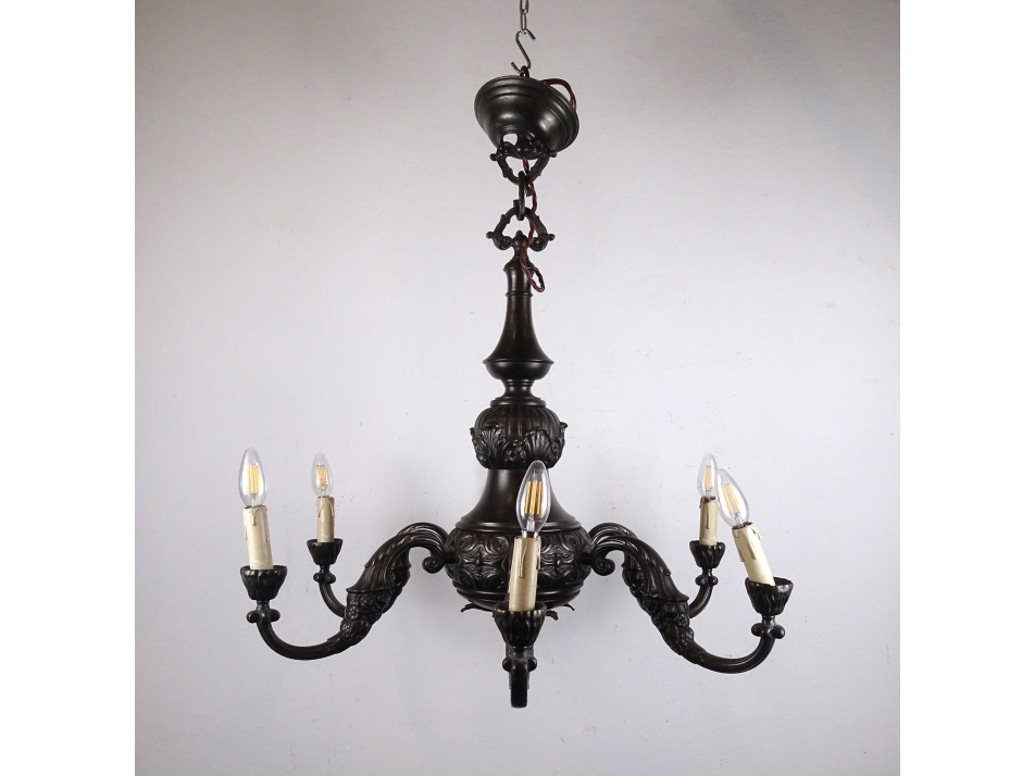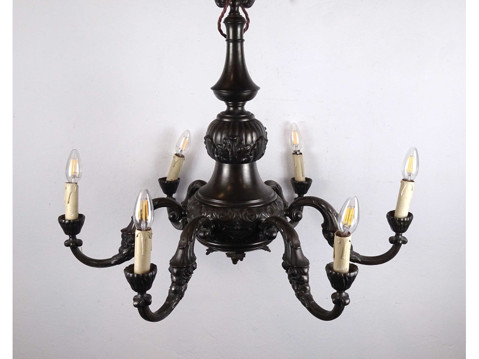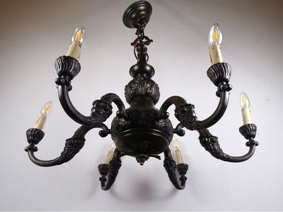 Antik 6 karú bronz csillár. A karok papírmasé gyertyákban végződnek, kis méretű (E14) izzó való bele. Némelyik gyertya eldől, javításra szorul.