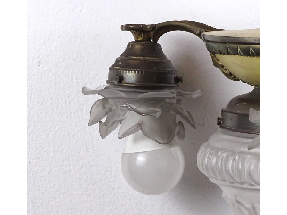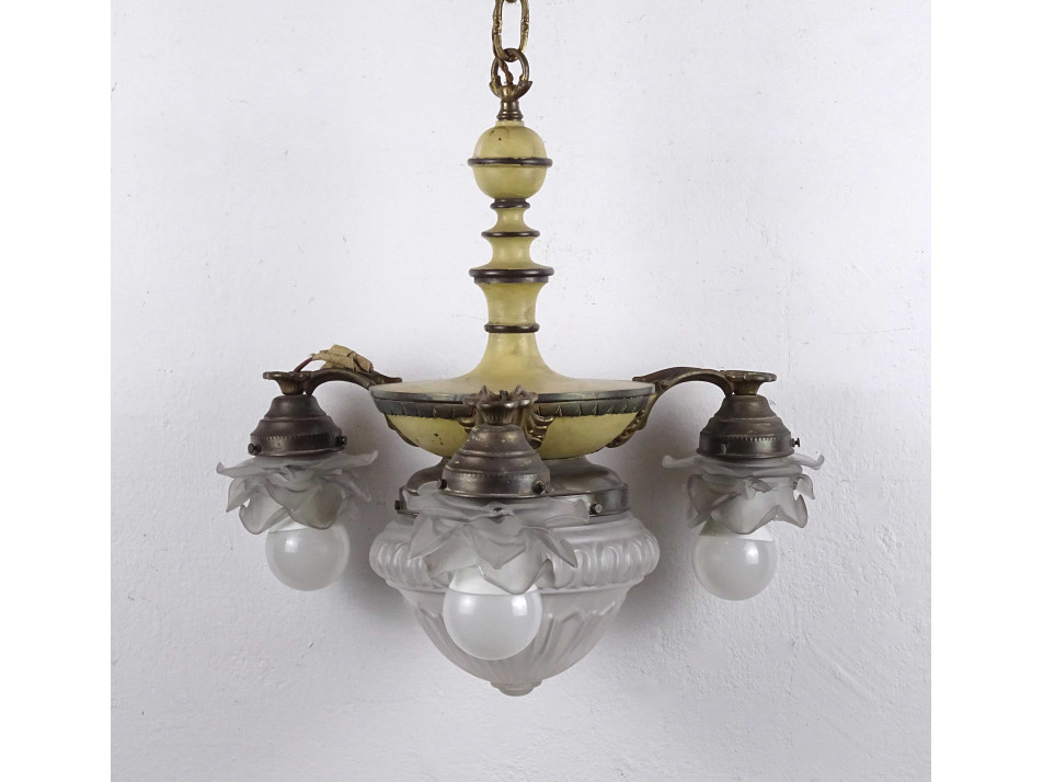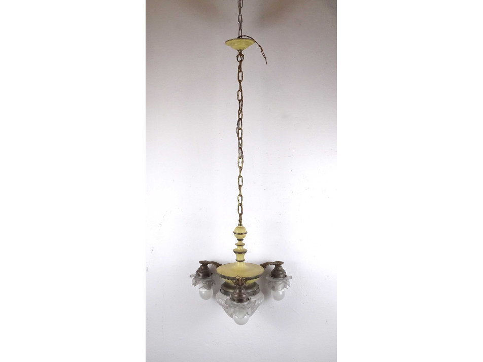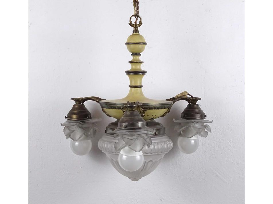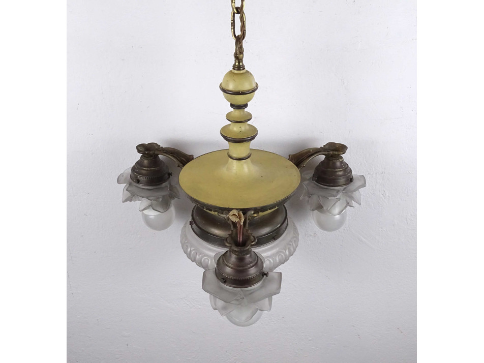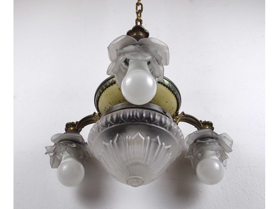 Régi, 3 karos, 4 égős, díszes, festett testű réz csillár. A karokon különleges üveg, rózsafejet formáló lámpaernyők találhatók, középen pedig egy csiszoltüveg búra. Nagyméretű (E27) izzó való bele.