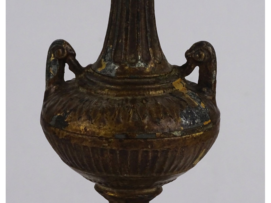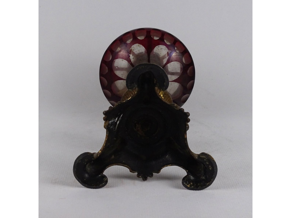 Szép állapotú, antik aranyozott spiáter lábon álló petróleum lámpa üveg cilinderrel. A tartály csiszolt, színezett, rétegelt bíborpácolt üveg.