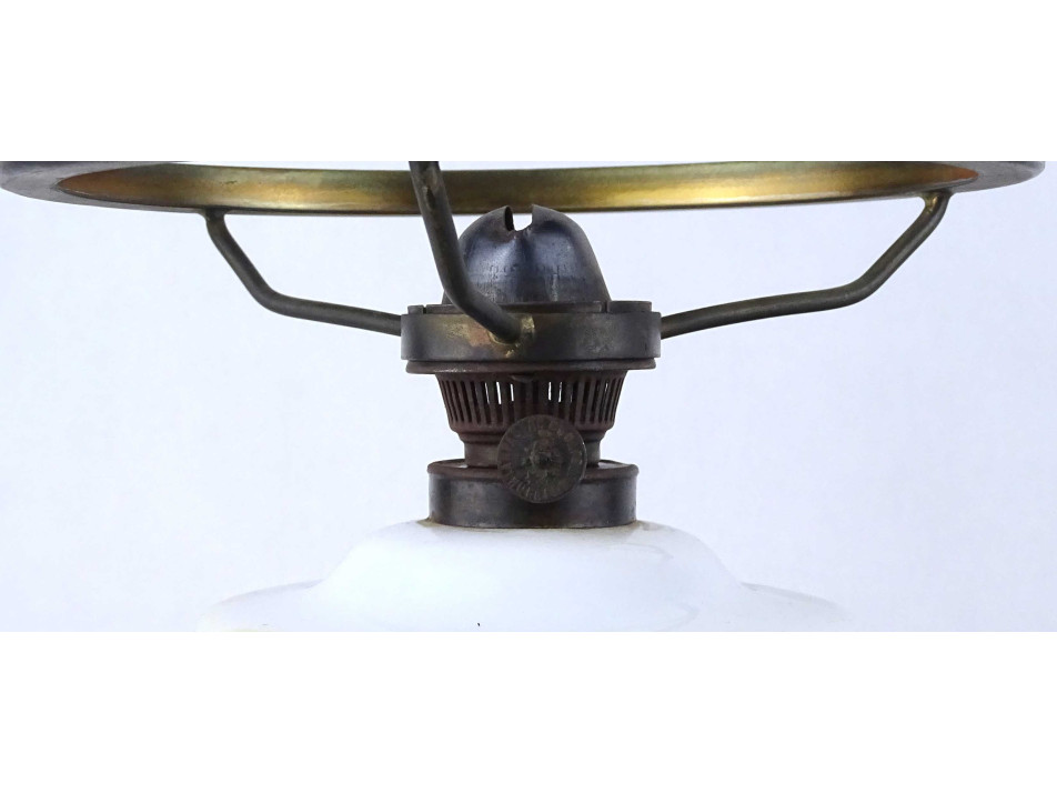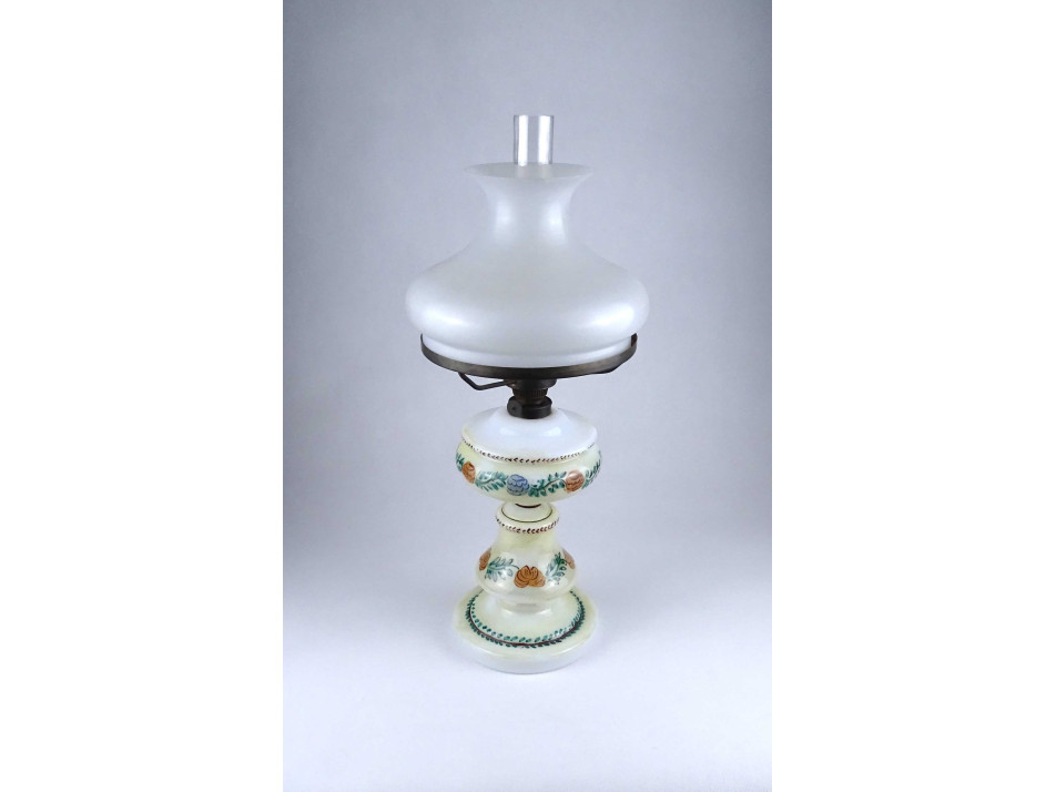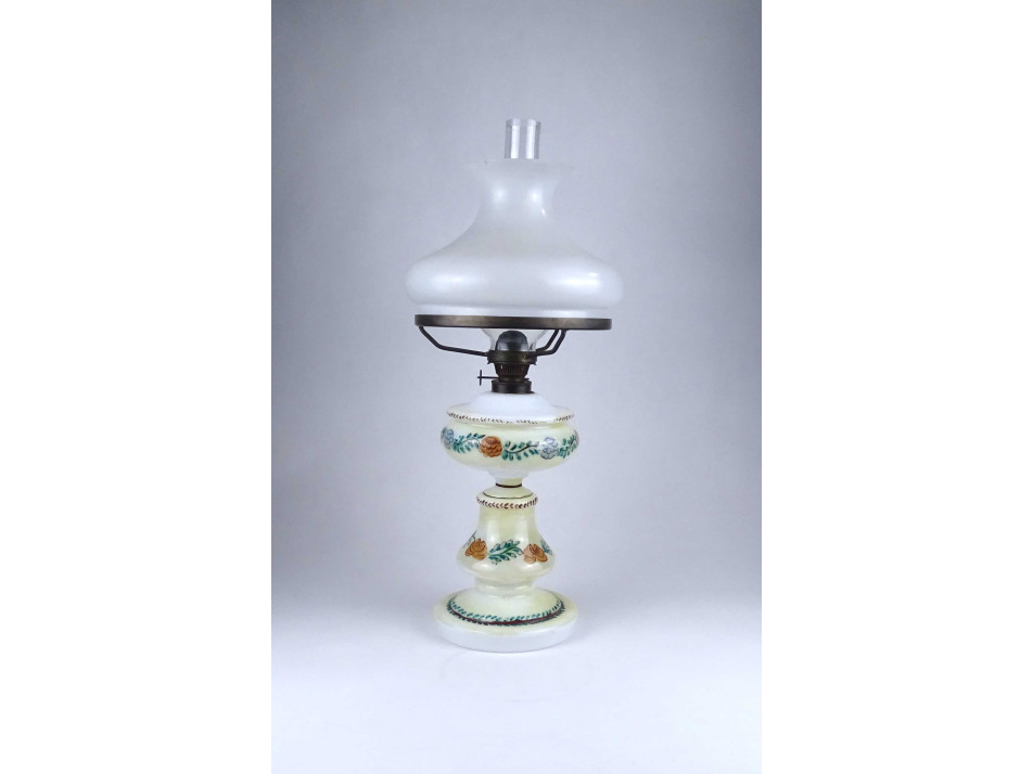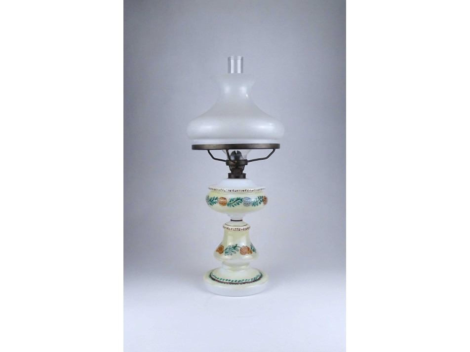 Antik, hibátlan állapotú, üveg petróleum lámpa, kézzel festett virágdíszítéssel, 20.5 cm átmérőjű tejüveg búrával, hibátlan cilinderrel.