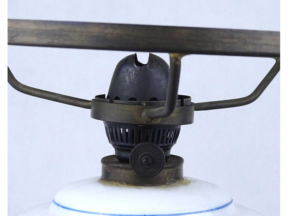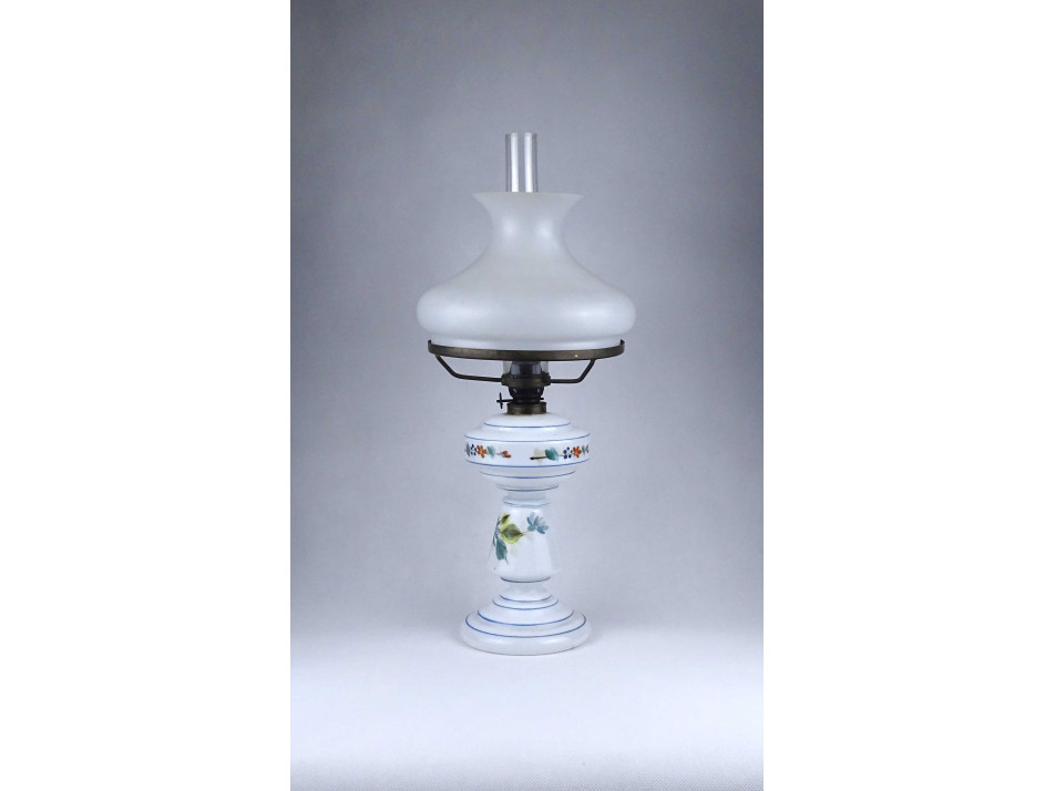 Antik, hibátlan állapotú, üveg petróleumlámpa, kézzel festett virágdíszítéssel, 20 cm átmérőjű tejüveg búrával, hibátlan cilinderrel.