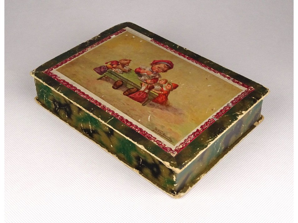 Antik kemény papírdoboz, bonbonos, cukorkás doboz. Tetején színes, babáival játszó, teázó szemüveges kislány kép.