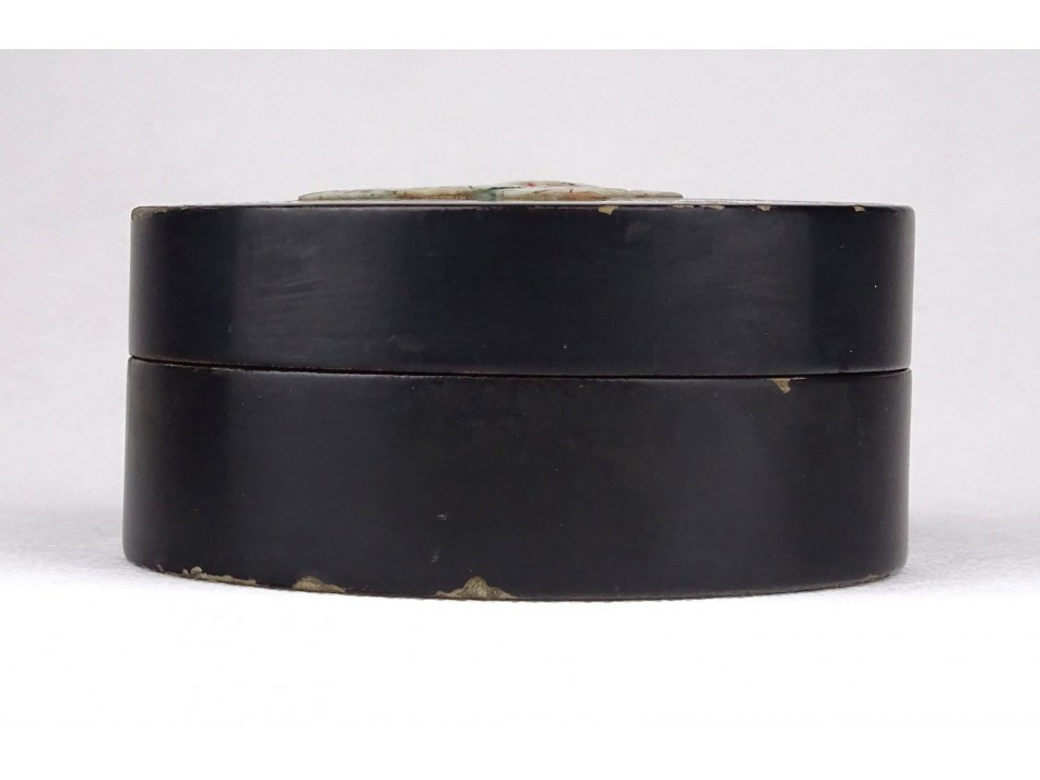 Régi fekete kínai kagyló berakással díszített lakkdoboz 9 cm