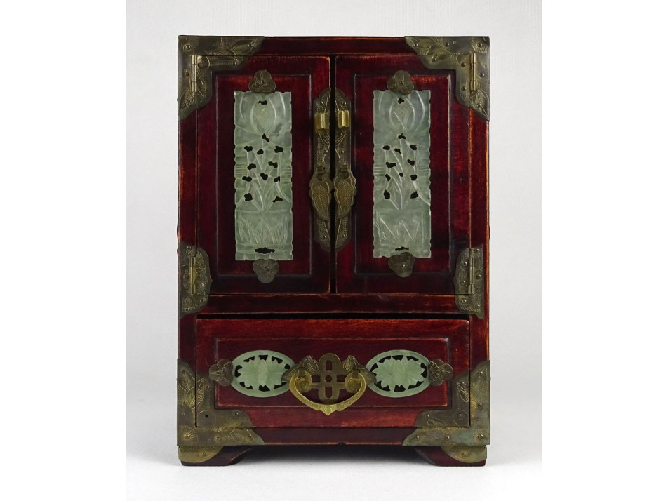 Régi, szép állapotú, mahagóni ékszeres kis méretű szekrény. Réz veretekkel, hord füllel rendelkezik. Körben összesen 8 darab faragott csiszolt jádekő berakás található. Ajtaja működő réz függőzárral zárható, kulcsa is megvan.