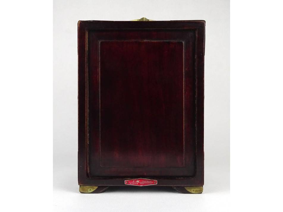 Régi jelzett kínai mahagóni ékszertartó lakkszekrény jádekő berakással 24.5 cm