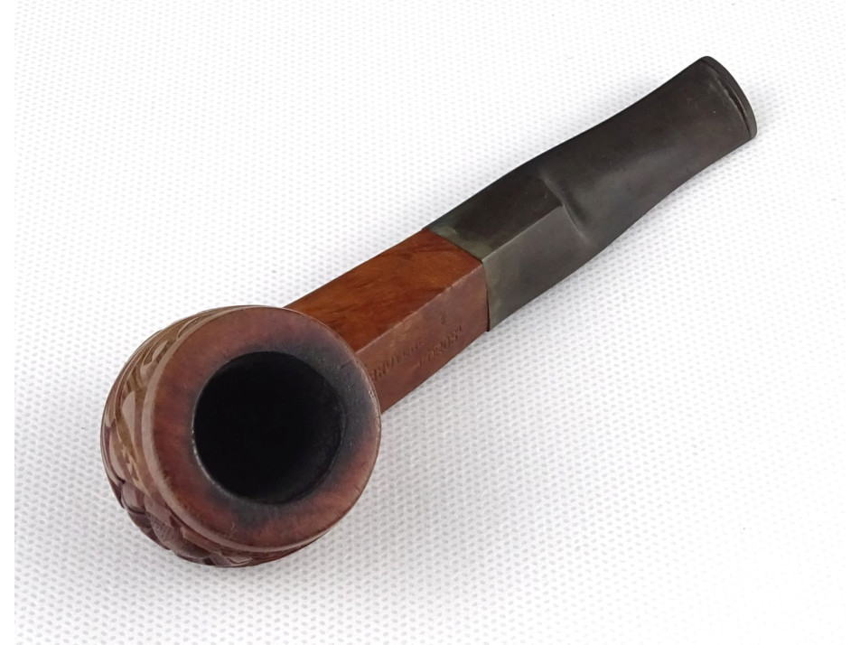 Szép állapotú, szögletes szárú, faragott fejű keményfa pipa. A fej rész vésett faragott virágokkal díszített.