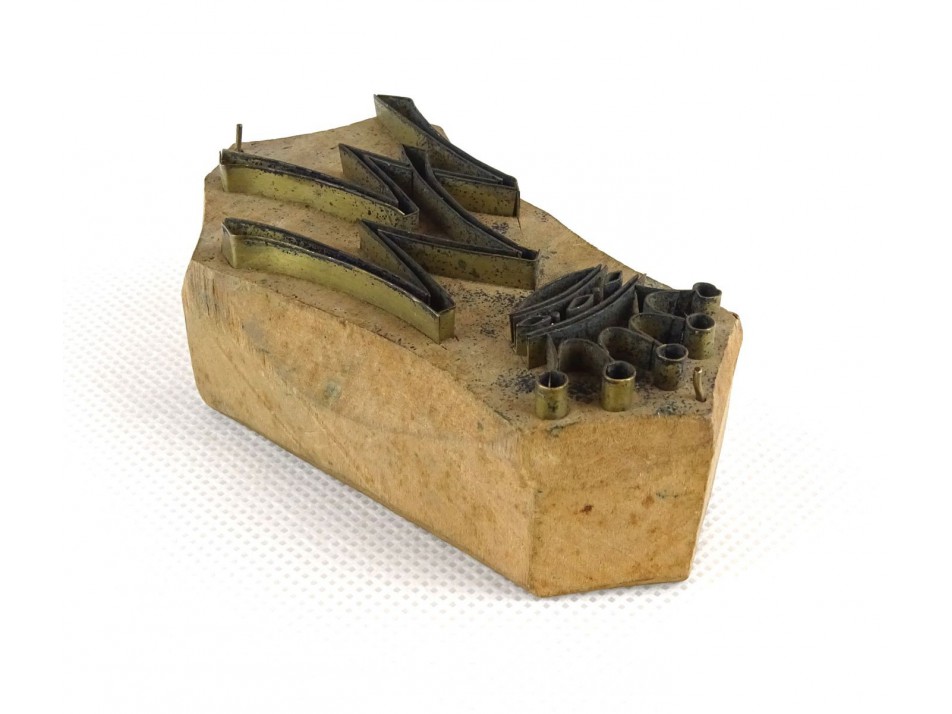 Antik kékfestő nyomóminta. Faragott keményfába illesztett réz iniciálés betűk.