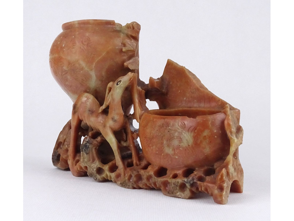 Régi faragott zsírkő szobor, dísztárgy. Vésett két virágtartó, közötte állat, szarvas, oldalán virág díszítéssel. Sérült, lásd fotó.